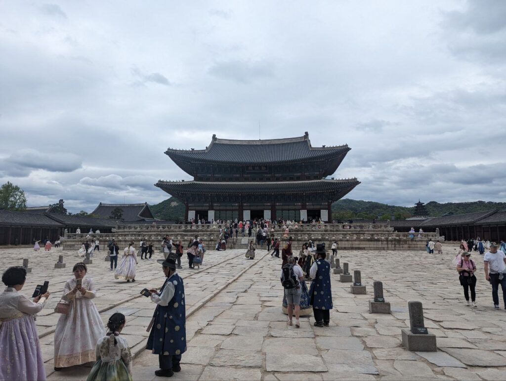 Sent lørdag aften – altså den 20. – landede vi i Seoul efter en lettere turbulent flyvetur fra Thailand. 3 timer senere ankom vi til vores lille lejlighed i Myeong-Dong-kvarteret. En af de timer gik med at finde en hæveautomat i lufthavnen, der både virkede og ville tage imod vores Mastercards. Det er ikke så let, som man skulle tro, i det højteknologiske Sydkorea. Men til sidst lykkedes det, og vi kunne omsider få lidt søvn, inden vi drog ud i det søndagsstille Seoul. Vi startede med turistattraktionen over dem alle: Gyeongbokgung-paladset. Her vrimlede det med turister og lokale iført de traditionelle dragter. Især kvinderne i deres yndige og farvestrålende Hanbok var fine at se på.
