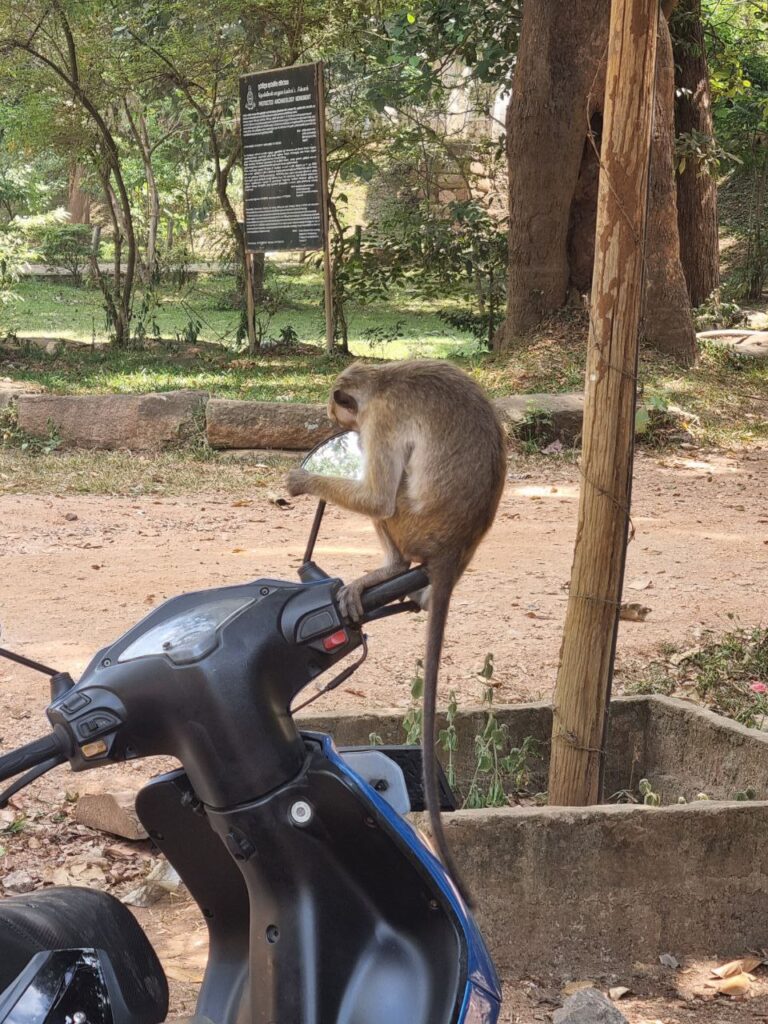 Når man sådan parkerer sin tuktuk i områder med aber, skal man sætte regnslaget for tuktukken, så aberne ikke kommer ind. (Fun fact: det gør de alligevel.) For det viser sig, at aber elsker at ødelægge køretøjer. Denne forsøgte ihærdigt at hive sidespejlet af en intetanende turists scooter og efterfølgende at bide hul i sædet, før vi fik skældt den tilstrækkeligt ud. Vi gætter på, at det er den samme, der havde sat utallige beskidte abepotespor i vores fine tuktuk! Og det var nok dens fætter, der huggede vores pandekage til morgenmaden dagen efter.