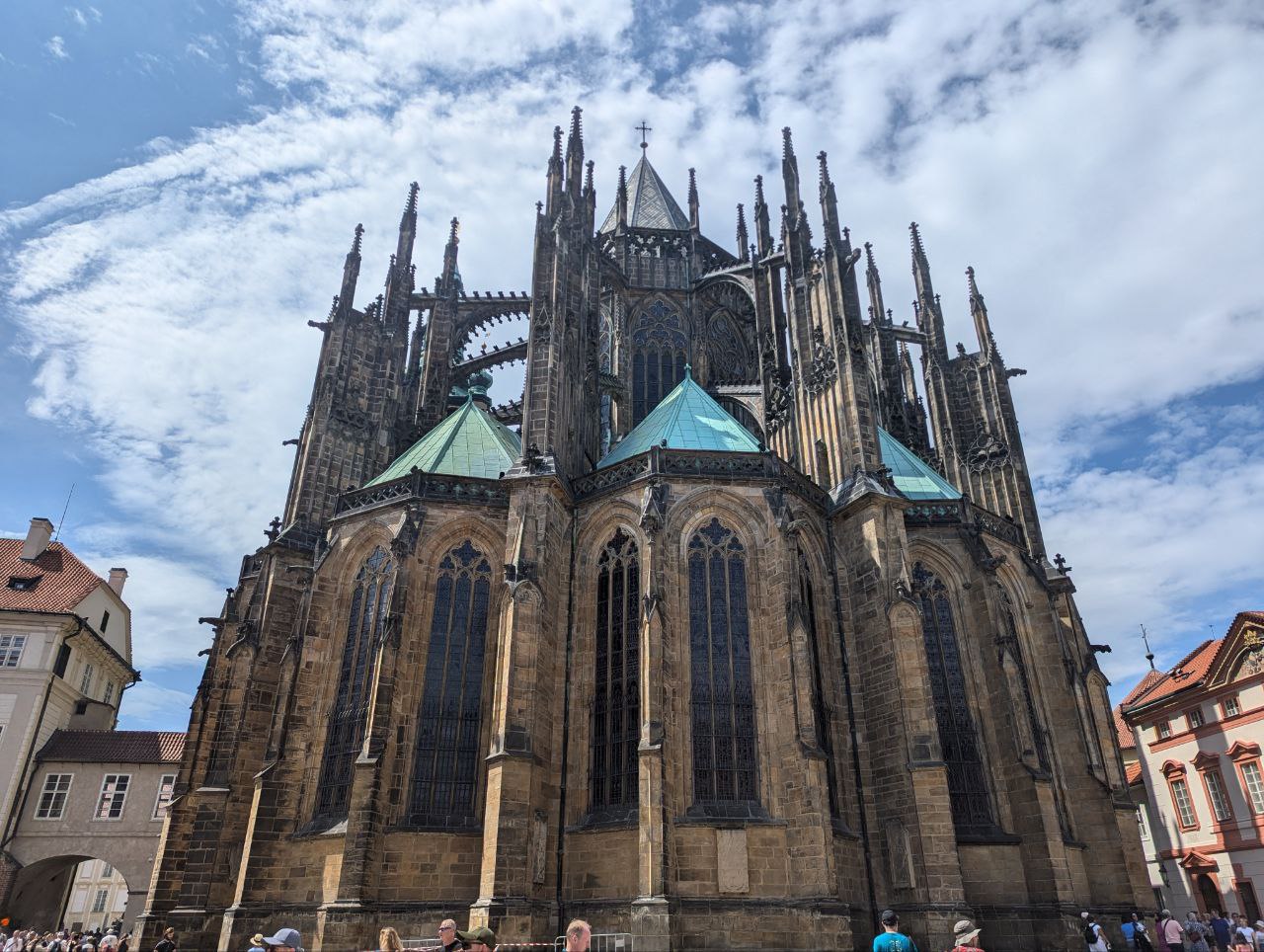 Vi tog afsked med vores nu elskede Dreseden og efter et par timer i endnu et tog stod vi af i Prag. Her skulle vi være i næsten tre uger, for at forsøge at få tiden til at gå inden en længe planlagt tur til England. Ja, vi har det altså hårdt. Vi lagde ud med et par nætter i midtbyen og turist… ikke helvede, men… mekka? Turistmekkaet, ja. Vi vandrede den gamle by tynd sammen med horder af andre turister, brugte tid på det fantastiske nationalmuseum, og var generelt helt overvældede af hvor smuk en by, Prag er. Smag og behag osv., men vi har svært ved at komme på en rival når det gælder udsmykning, historiske bygninger, gyldne spir og generel charme. På samme måde er Prag nok også i top, når det gælder souvenirbutikker og trdelnik-bikse (stort og grotesk dyrt sukker-kanel-snobrød fyldt med is, chokolade og den slags). Men med den mængde af turister, er det ikke så underligt.