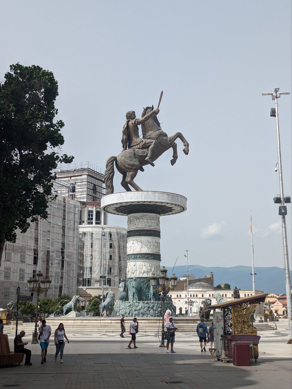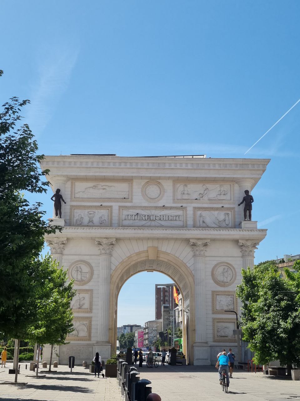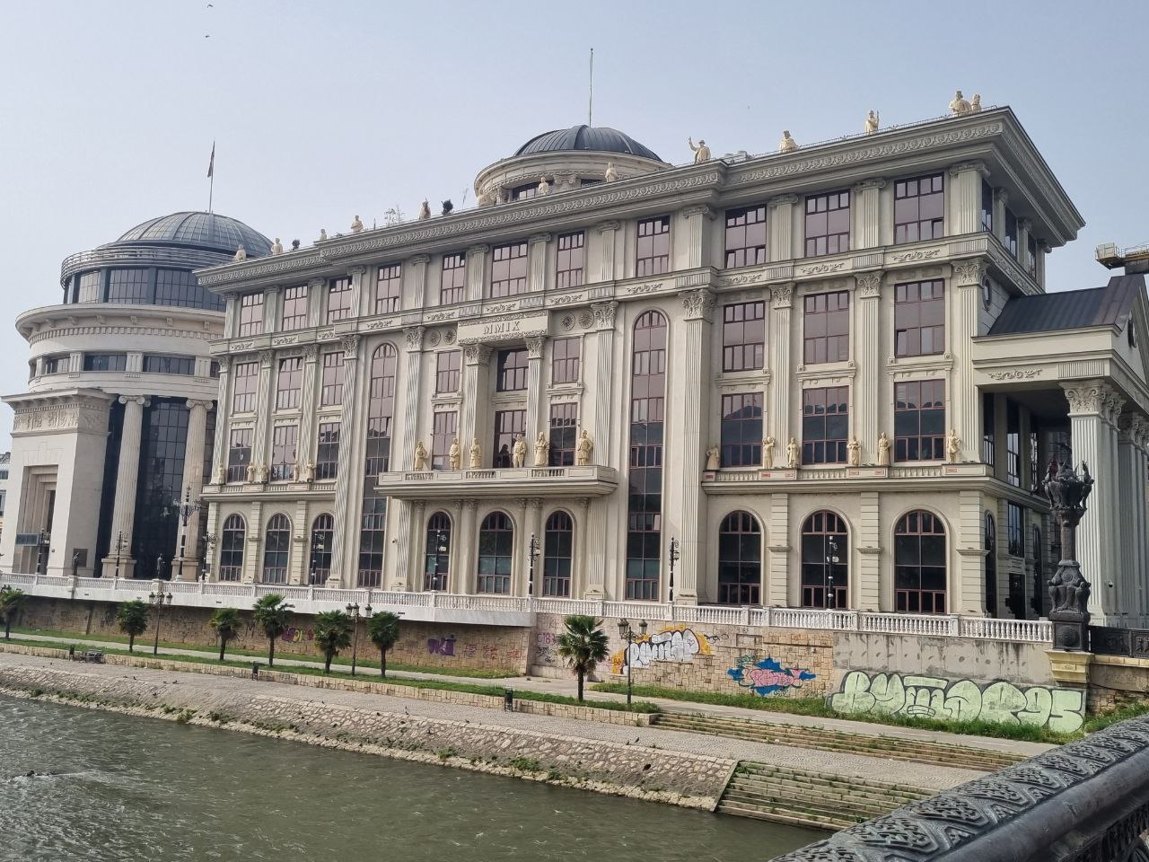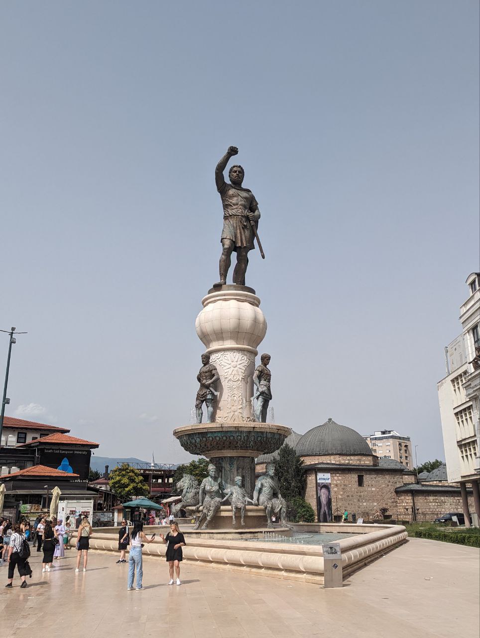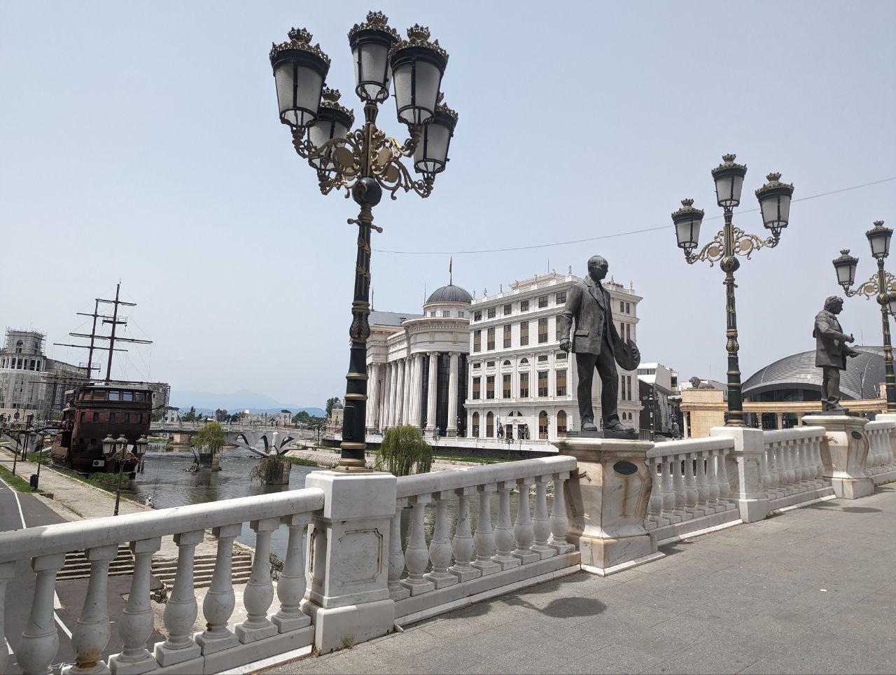 Vi havde kun 2 hele dage i Skopje. Den ene blev brugt på endnu en guidet gåtur med div. historiske godbidder. En sjov ting ved byen er, at man fra 2009 til 2014 brugte tonsvis af penge på at få byen til at se mere klassisk ud ved at opføre 120+ statuer og monumenter. Mange af dem totalt overdimensionerede. Det giver byen et lidt kunstigt og underligt udtryk, men det er nu en vildt hyggelig by alligevel. Den gamle bazaar ligner en total turistfælde med isboder, souvenirbutikker og fortorvsrestauranter overalt. Eller hvad man nu kalder restauranter i et område, hvor alt er fortorv? Bare restauranter? Uanset, så er det ikke en turistfælde overhovedet, og langt de fleste besøgende er lokale. Så her fyldte vi os med red bull-is, lokale retter og makedonsk rødvin. De lokale retter minder en hel del om de georgiske – altså salater med tomater og agurk, bønnegryder og ostebrød – så det var ok lækkert.