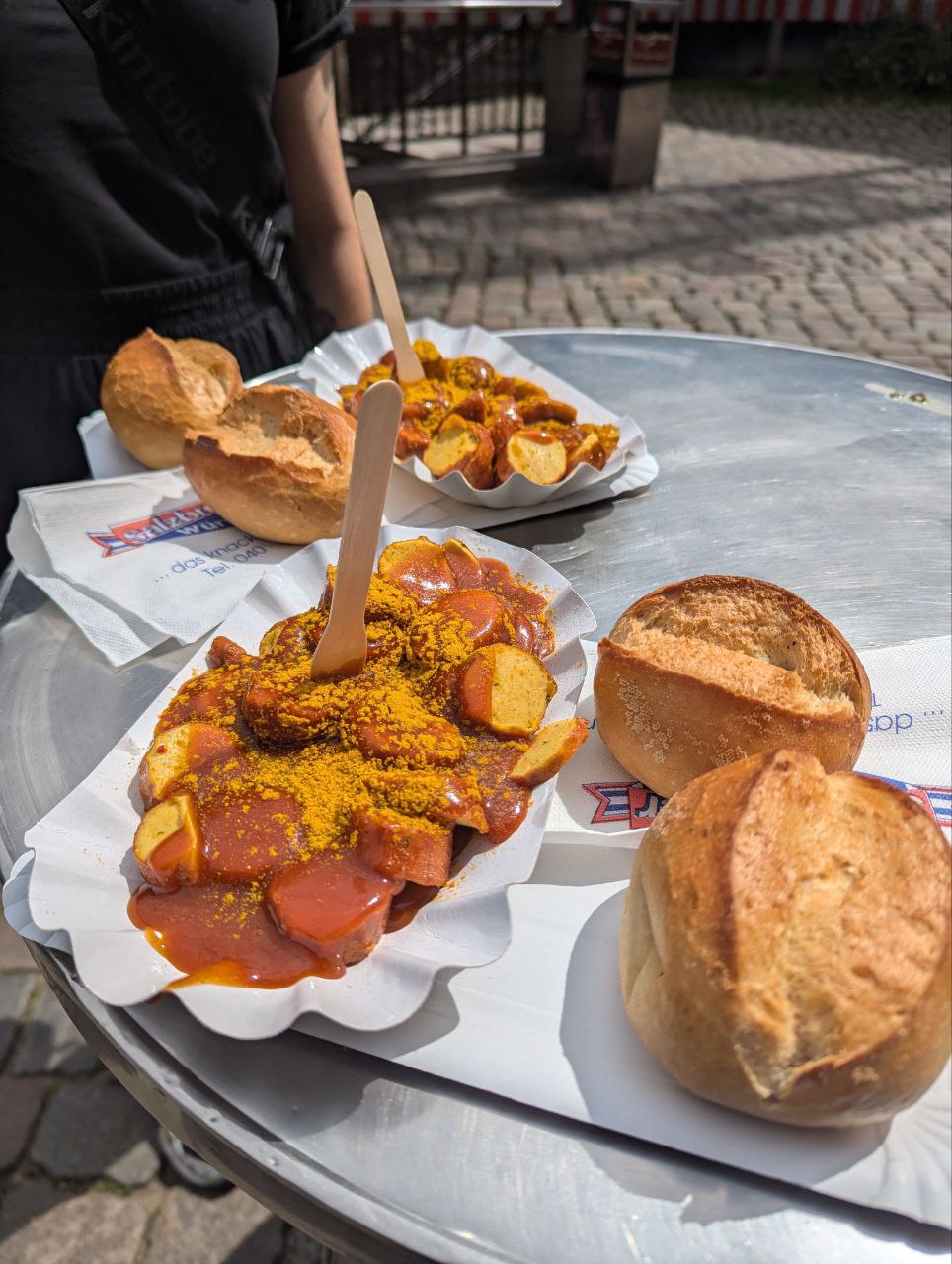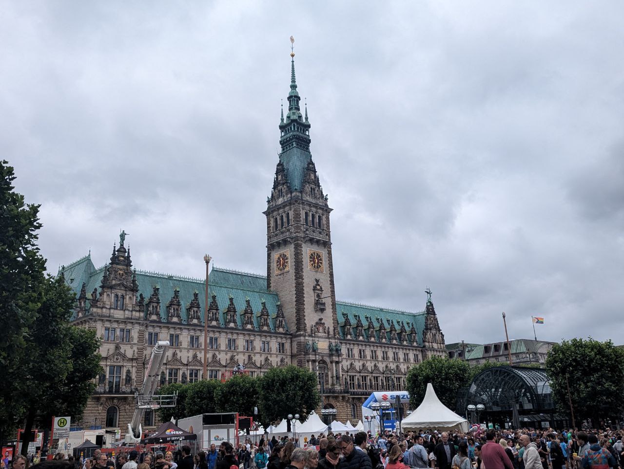 Vegansk currywurst omg, Nikolai-kirken, et rådhus omringet af triatlon og en bittelille bro.