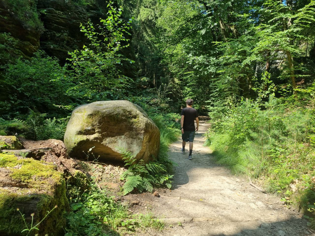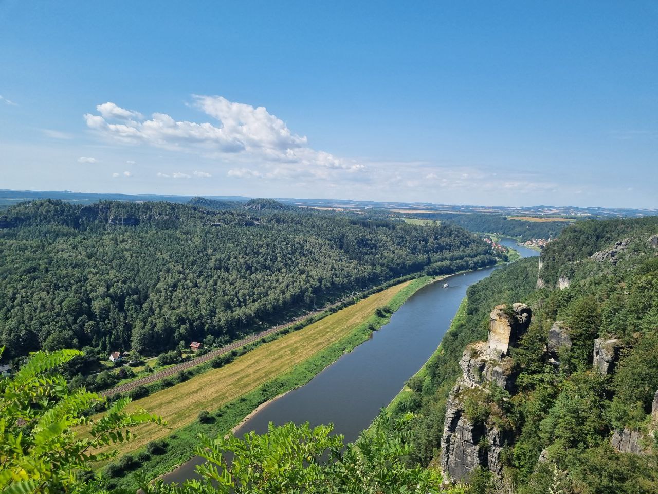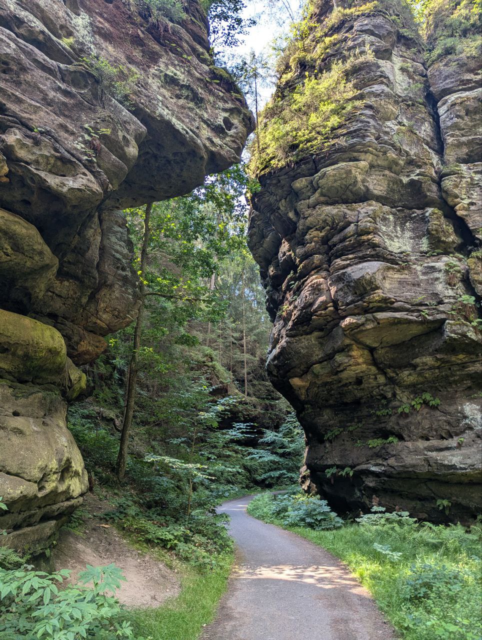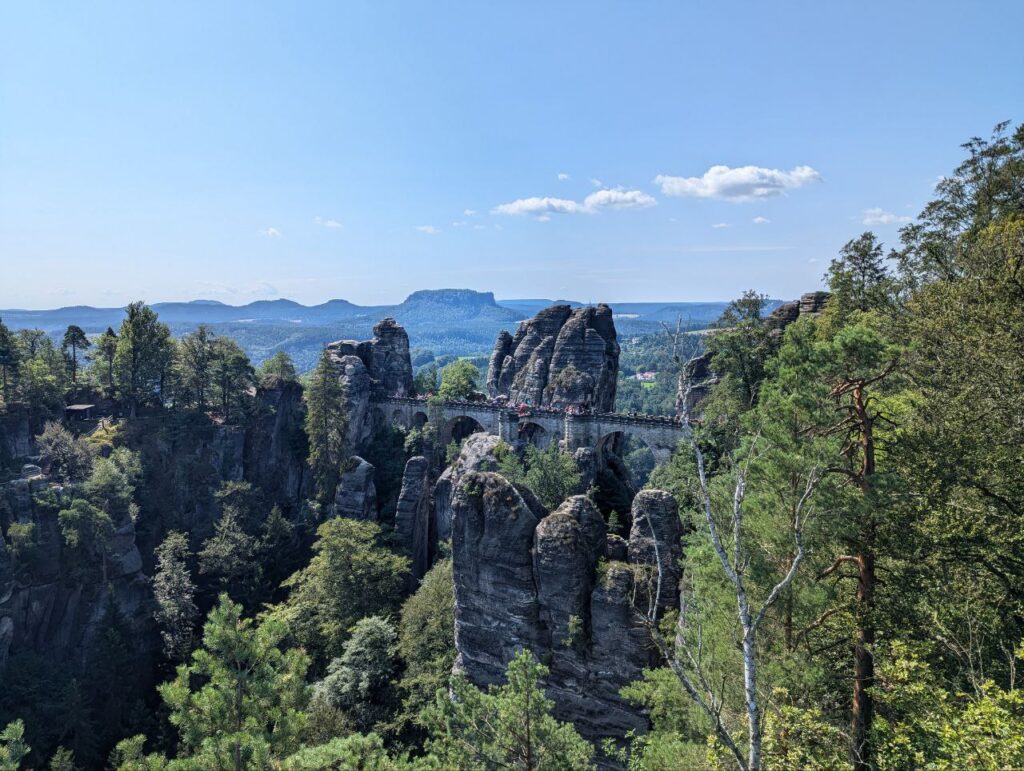 Men hvor hyggelig heiden end var, kan det ingenlunde hamle op med vores tur til nationalparken Saksiske Schweiz. Det har intet med Schweiz at gøre, men der er bjerge. Der er også en fin bro og en eventyrlig skovkløft (hvis det er et ord). Turen krævede blot en kort togtur, en lille færgetur over Elben og en stejl, men kort gåtur op ad sandstensbjerget. Der var helt og aldeles proppet med andre som os. De fleste havde heldigvis ikke i sinde at gå meget længere end Bastei-broen og udsigtsposterne, så resten af den 3+ timer lange gåtur havde vi området nærmest for os selv.
