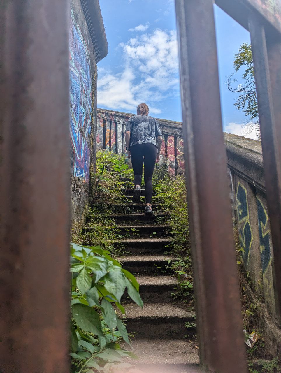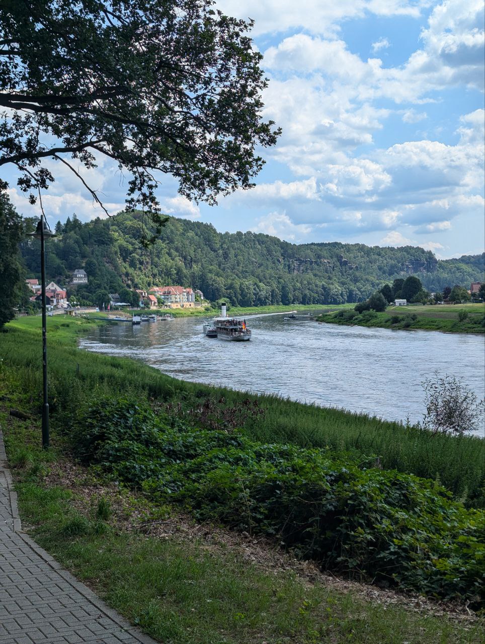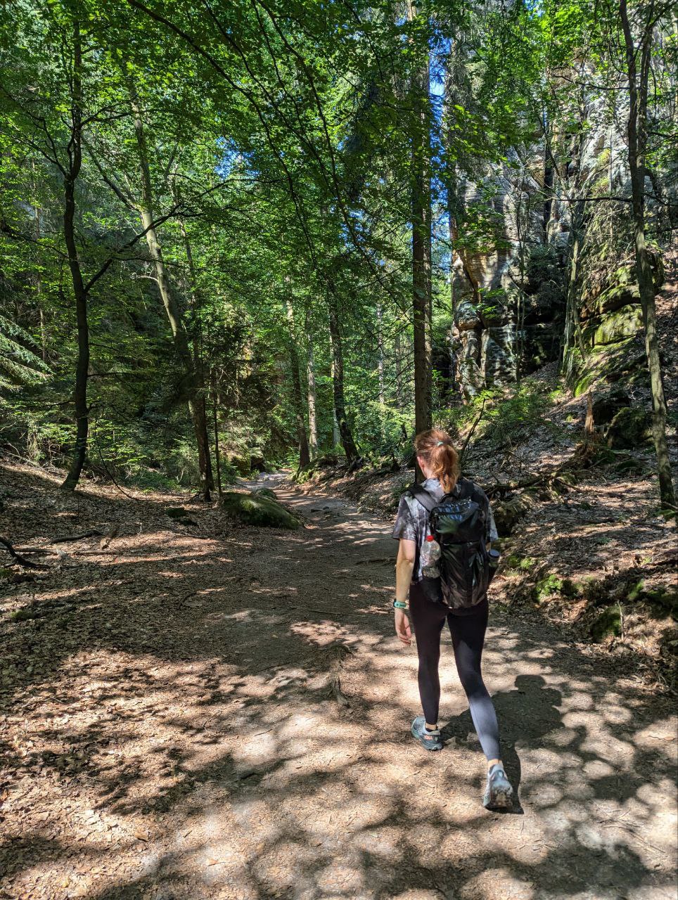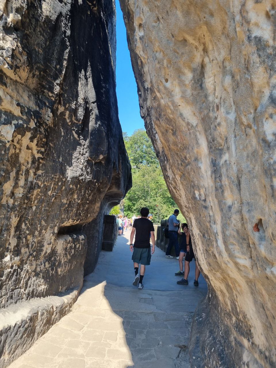 Men hvor hyggelig heiden end var, kan det ingenlunde hamle op med vores tur til nationalparken Saksiske Schweiz. Det har intet med Schweiz at gøre, men der er bjerge. Der er også en fin bro og en eventyrlig skovkløft (hvis det er et ord). Turen krævede blot en kort togtur, en lille færgetur over Elben og en stejl, men kort gåtur op ad sandstensbjerget. Der var helt og aldeles proppet med andre som os. De fleste havde heldigvis ikke i sinde at gå meget længere end Bastei-broen og udsigtsposterne, så resten af den 3+ timer lange gåtur havde vi området nærmest for os selv.