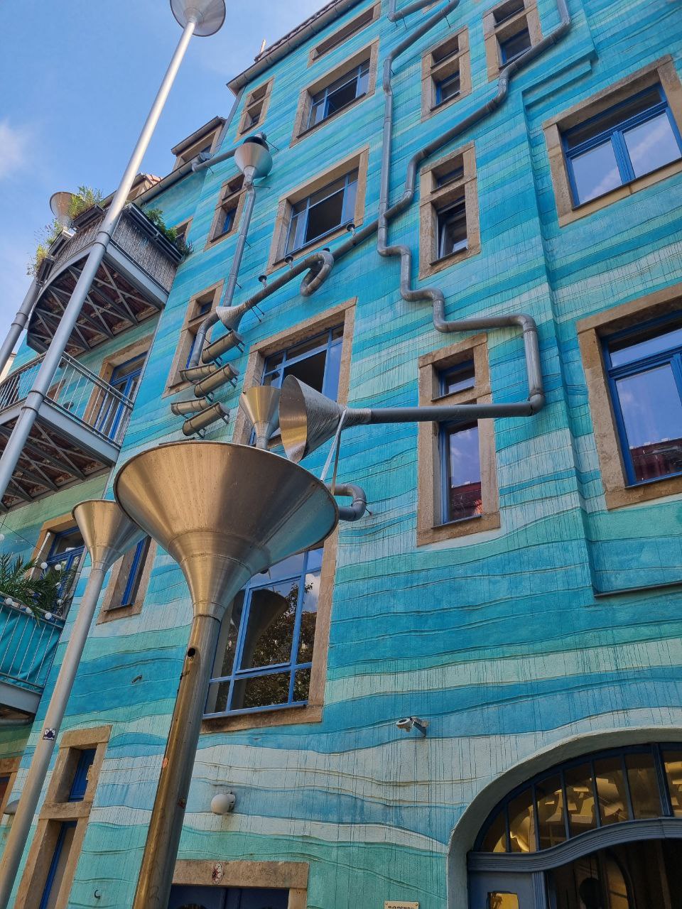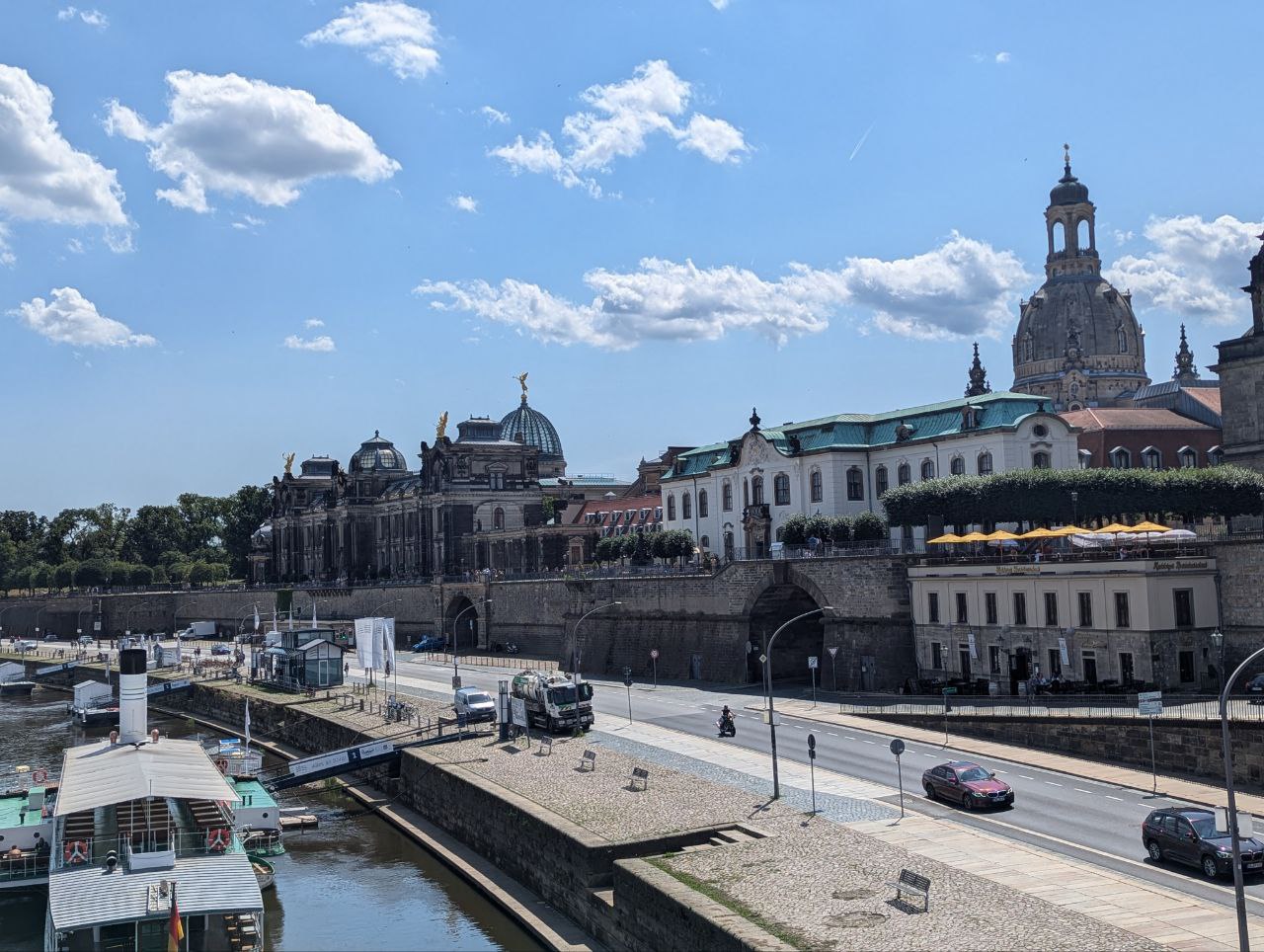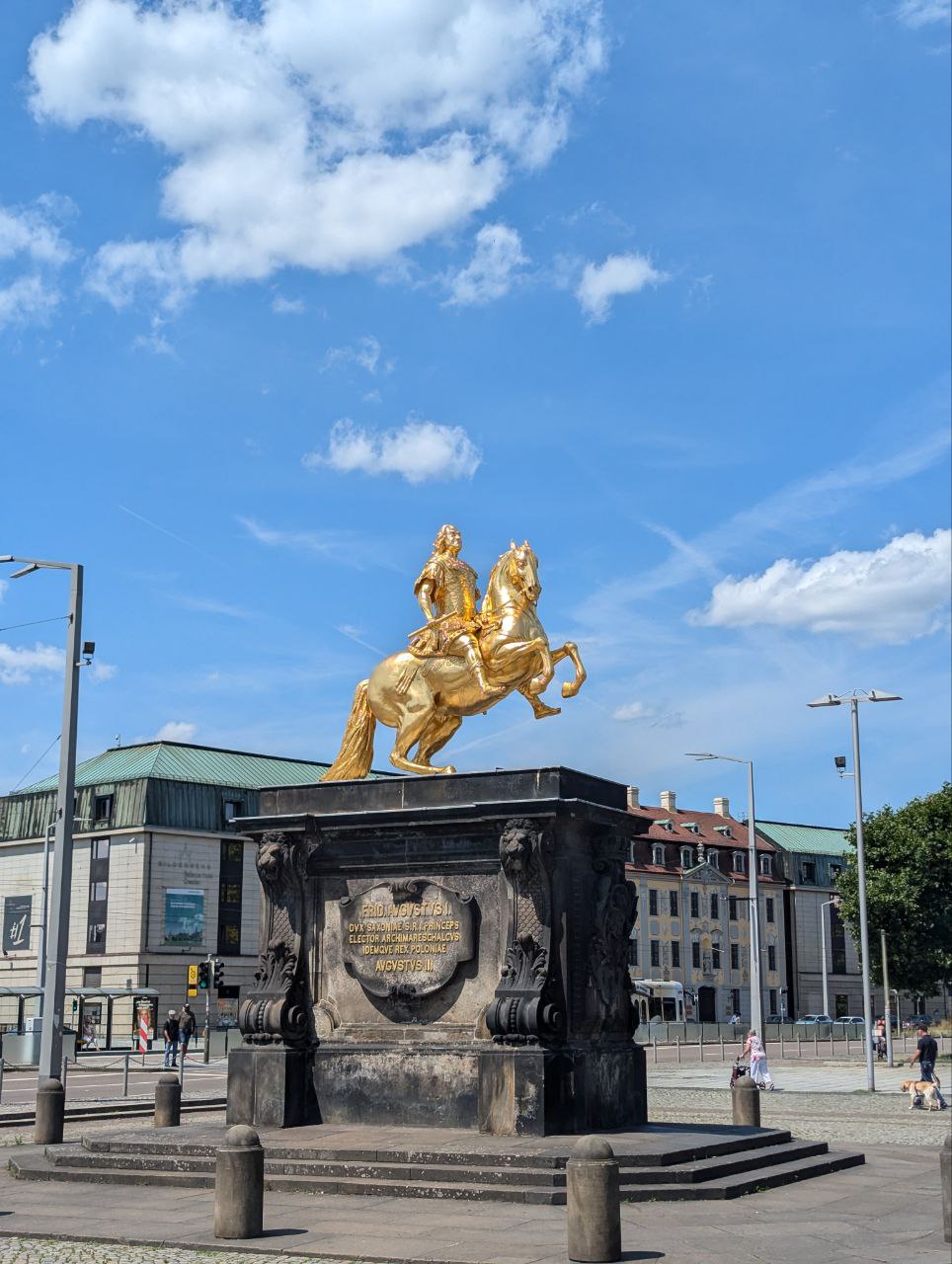 For ikke forsumpe helt i planlægning og altanafslapning tog vi på en – du gættede det – gratis guidet rundtur i Dresden. Der er meget mindre krigshistorie, end man skulle tro, og meget mere arkitektur og byplanlægning. Genopbygningen efter alle krigene og bomberier er måske også vigtigere end krigene og bomberierne selv. Så vi fik en grundig gennemgang af slotte, museer og kirker. Heldigvis er der også rigtigt mange meget skinnende gulddimser at beundre. Nåja, og nogle kunstneriske bygninger i den nye og mere trendy bydel.