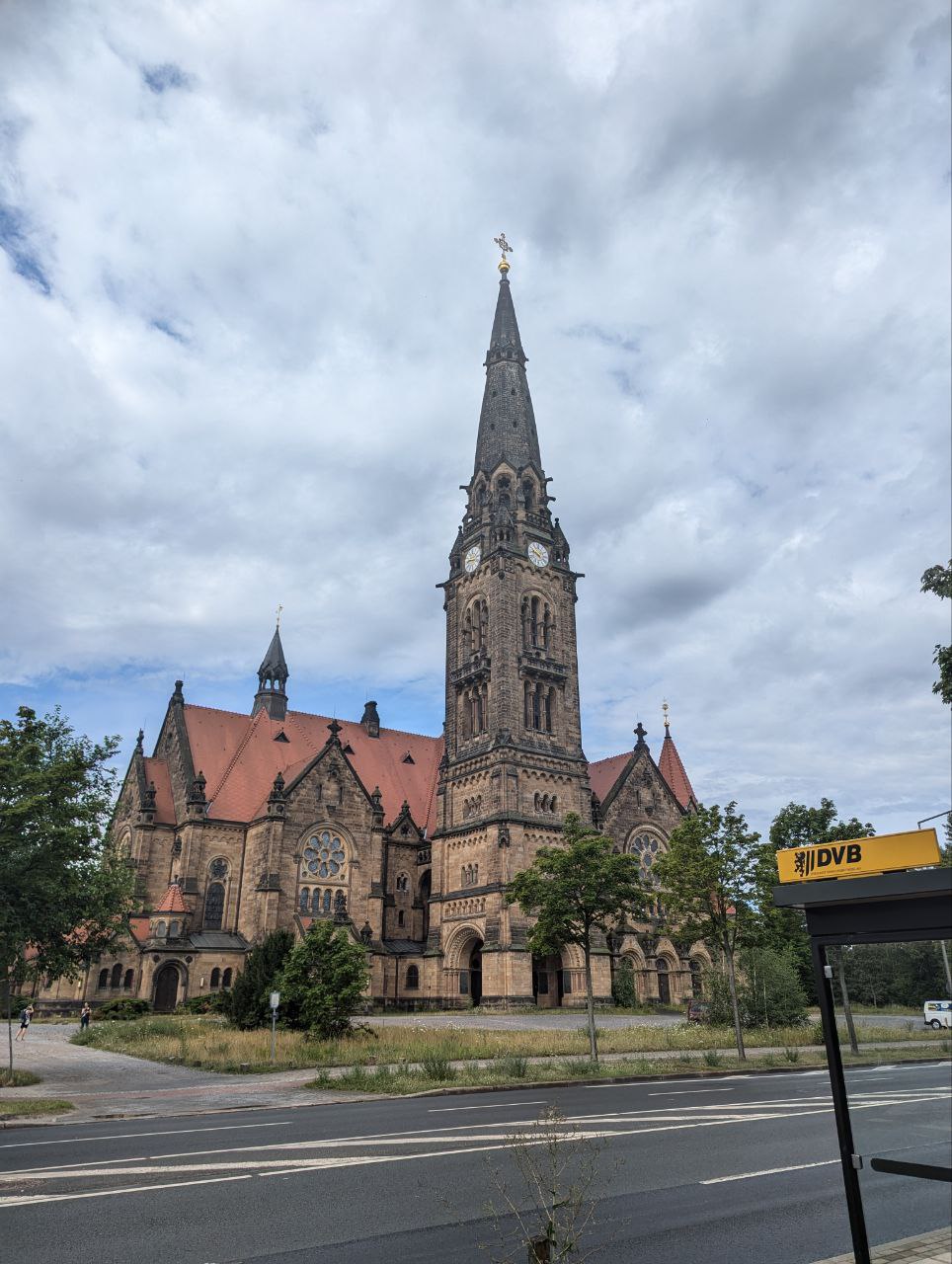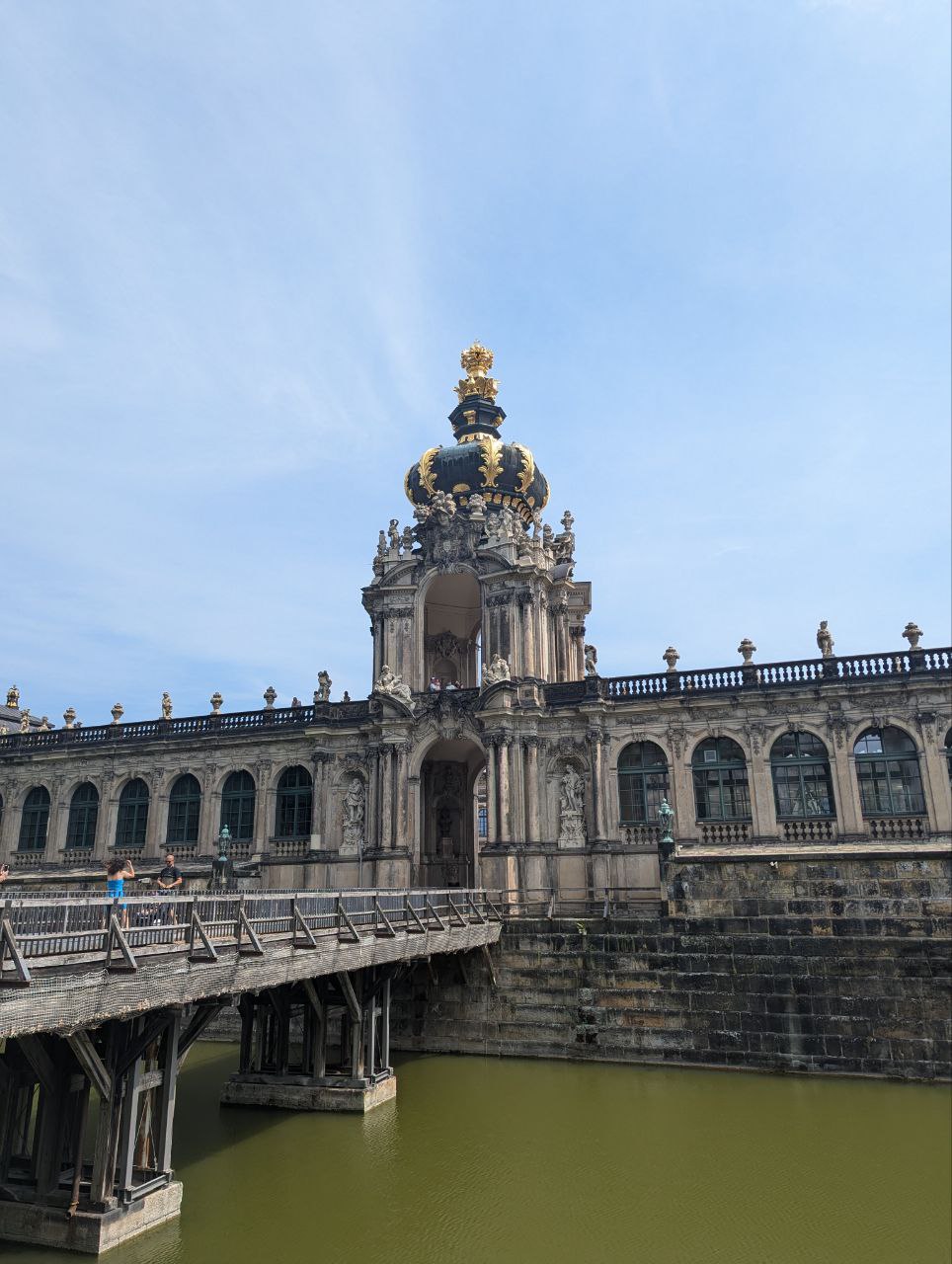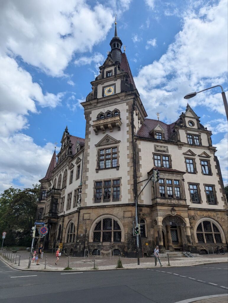 For ikke forsumpe helt i planlægning og altanafslapning tog vi på en – du gættede det – gratis guidet rundtur i Dresden. Der er meget mindre krigshistorie, end man skulle tro, og meget mere arkitektur og byplanlægning. Genopbygningen efter alle krigene og bomberier er måske også vigtigere end krigene og bomberierne selv. Så vi fik en grundig gennemgang af slotte, museer og kirker. Heldigvis er der også rigtigt mange meget skinnende gulddimser at beundre. Nåja, og nogle kunstneriske bygninger i den nye og mere trendy bydel.