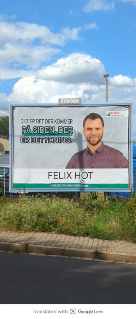 Men så var det også slut med hotel og restauranter, for vi skulle med toget til Dresden, hvor vi havde bestemt os for at lege hverdag i et par uger. Altså den slags hverdag, der hverken involverer job eller indtægt. Så vi flyttede ind i en hyggelig lejlighed med altan i Plauen-kvarteret syd for den gamle bydel. Her kunne vi chille i den store sofa og lave mad helt selv! Sidstnævnte var overraskende rart efter 6 måneder med daglige restaurantbesøg, hvor utroligt det end lyder. Det blev ikke mindre fedt af, at udvalget i de tyske supermarkeder er vanvittigt godt. Vi har da sjældent, faktisk aldrig, set så mange veganske produkter. Gisp, vi er bagud i Danmark. Derudover er priserne yderst fornøjelige. Så køleskabet blev fyldt, og vi gav os til at lege lokale. Vi havde dog stadig brug for lidt oversættelsesassistance, ellers havde vi aldrig regnet ud, hvad reklamen overfor lejlighed handlede om: